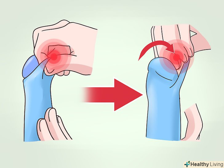 Розтягніть вуздечку.якщо крайня плоть відтягується недостатньо, ймовірно, вам буде потрібно розтягнути вуздечку. Візьміть крайню плоть великим і вказівним пальцями в місці з'єднання з вуздечкою відразу під головкою. Потягніть шкіру від головки вниз. Тримайте в такому положенні 30 секунд.[4]- Таке розтягування можна виконувати кожен раз після сечовипускання або в спеціально відведений для цього час.
