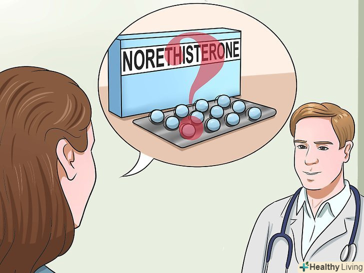 Запитайте лікаря про норетистерон.якщо вам не підходить варіант прийому протизаплідних таблеток, проконсультуйтеся з лікарем про застосування рецептурного препарату норетистерон. Норетистерон необхідно приймати три рази на день за кілька днів до менструації.[6]- Перед настанням менструації рівень прогестерону падає, через що відторгається слизова матки, і виникає кровотеча. Підтримка високого рівня прогестерону затримує настання менструації або зупиняє її.[7]