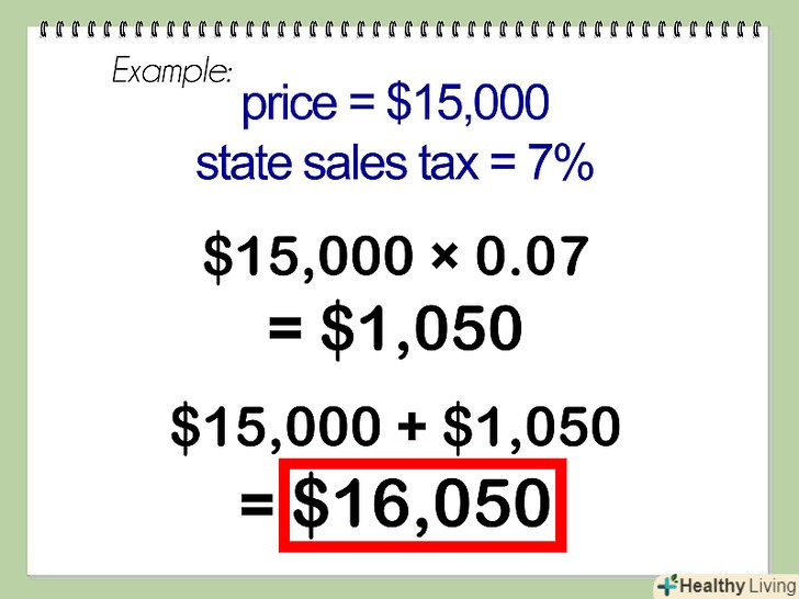 Розрахуйте суму податку з продажів у вашому районі, а потім додайте цю суму до орієнтовної ціни покупки автомобіля.наприклад, в області з 7-ми процентним податком з продажів, податок на автомобіль вартістю в $15,000 доларів складе $1,050, тоді як кінцева ціна автомобіля буде дорівнює $16,050 доларів.- У деяких американських штатах не можна відняти податок з продажів на старий автомобіль, що здається в рахунок покупки нового. Податок доведеться заплатити на загальну суму покупки.