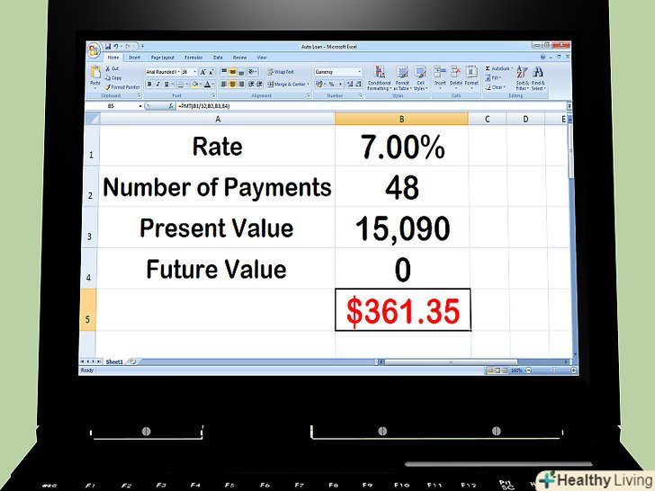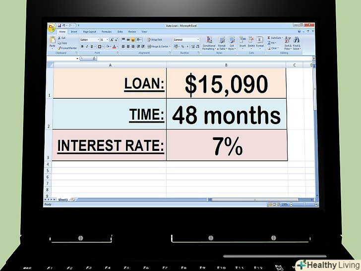 За допомогою програми Excel розрахуйте місячні виплати по кредиту.для цього необхідно використовувати функцію PMT. Візьмемо наприклад кредит на суму в 15,090 доларів, який необхідно виплатити за 48 місяців при ставці в 7 відсотків річних.