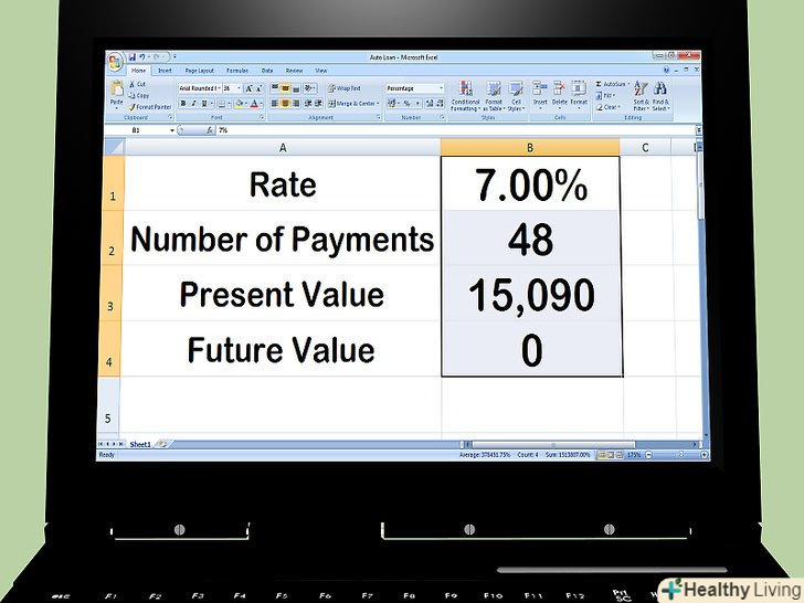 Введіть формулу "=PMT(B1/12,B2,B3,B4)" у клітинку знизу від цифр.- Введіть " =PMT ("клікніть на комірку з 7%, таким чином" B1 " з'явиться після лівих лапок.