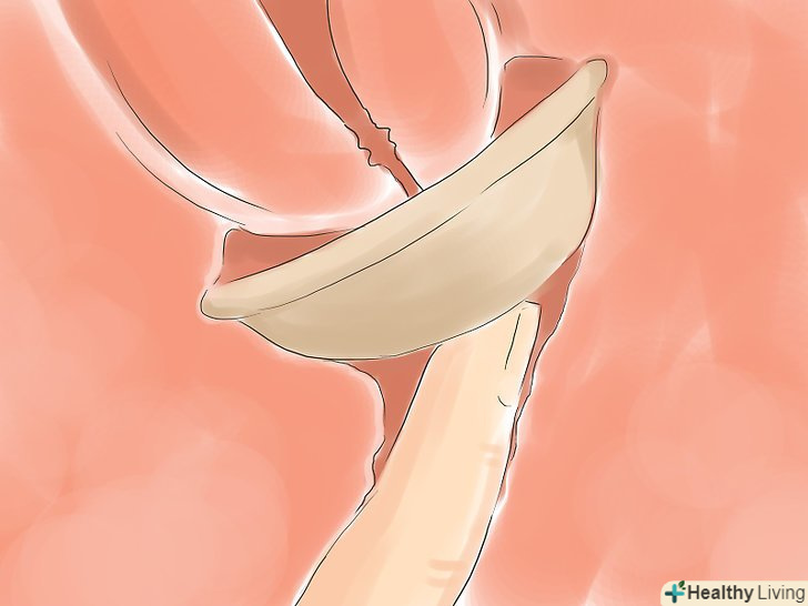Вставте діафрагму за 6 годин до статевого акту.ви можете вставити її в положенні лежачи, сидячи навпочіпки, піднявши ноги або стоячи. Тримайте діафрагму таким чином, щоб внутрішня частина ковпачка була звернена до піхви. Уявіть собі, що збираєтеся надіти шапочку на шийку матки. Шийка матки повинна бути покрита тією стороною, де гель.- Якщо ви не знаєте, що таке шийка матки, то уявіть собі піхву у вигляді коридору. Стінки піхви розкриваються легко, а шийка матки знаходиться в кінці коридору, вона тверда і круглої форми. Коли ви дійдете до кінця стінки піхви, ви відчуєте шийку матки, як ніби ви торкаєтеся до кінчика носа. Деякі народжували жінки розповідають, що шийка матки за відчуттями нагадує фертильні губи.