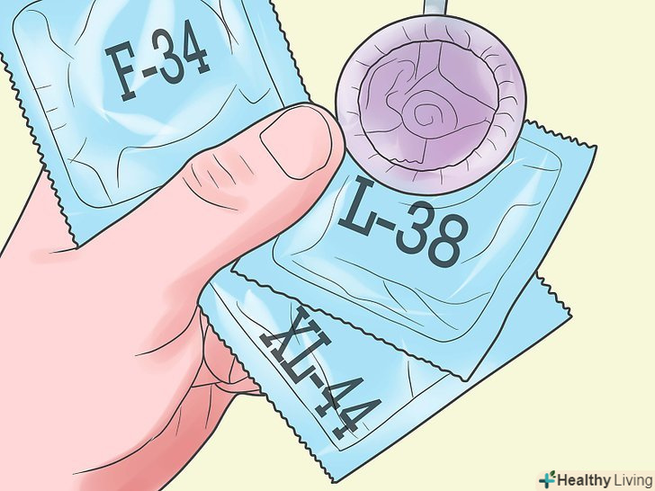 Підберіть відповідний розмір.більшість презервативів підходять для пеніса середнього розміру (від 10 до 18 сантиметрів в довжину). Спробуйте використовувати презерватив середнього розміру і визначте, наскільки добре він вам підходить. Якщо він надівається з легкістю і тримається міцно, вам підходить цей розмір. Якщо він сидить вільно і може впасти, спробуйте використовувати презерватив меншого розміру. Якщо він сидить щільно і заподіює біль або виглядає так, що може лопнути, спробуйте використовувати презерватив більшого розміру. Підібрати потрібний розмір найкраще, випробувавши різні варіанти. Ви можете вивчити розміри презервативів на спеціалізованих вебсайтах в Інтернеті.- Форма також є важливим фактором при підборі відповідного презерватива. Різні бренди випускають трохи відрізняються за формою презервативи, тому найкраще поекспериментувати, щоб визначити яка модель найкраще підходить вашій формі пеніса. В крайньому випадку підійде презерватив будь-якої форми; різниця тільки в тому, наскільки комфортно і природно відчуття при його використанні.