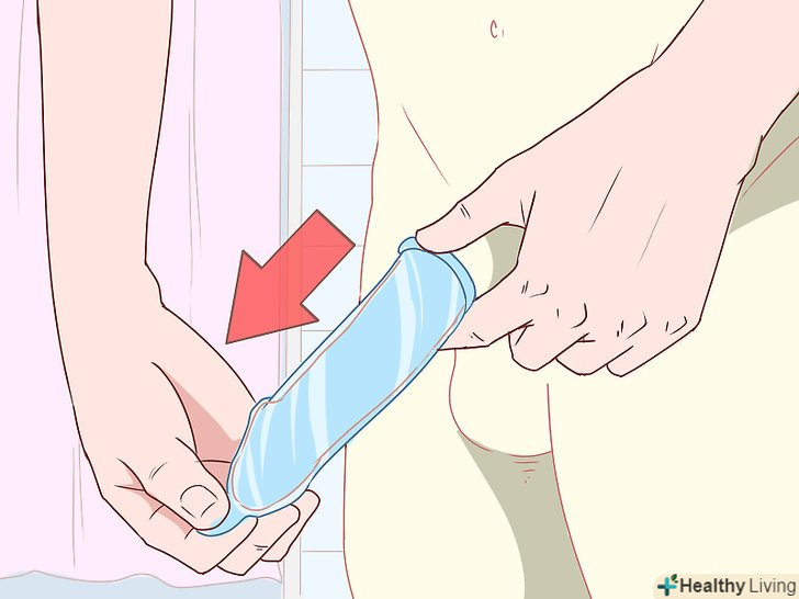 Візьміться за зовнішнє кільце жіночого презерватива.притримайте зовнішнє кільце презерватива однією рукою. Стисніть кільце і перекрутіть вхідний отвір презерватива таким чином, щоб насіннєва рідина не витекла. Обережно витягніть презерватив з піхви. [4]- Перевірте цілісність презерватива. Подивіться, чи не порвався він. Якщо це сталося, подумайте про застосування засобів екстреної контрацепції і здачі аналізів на ЗПСШ.