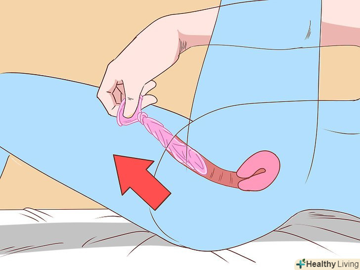 Притримайте презерватив за кільце і витягніть пеніс з піхви.після закінчення сексу однією рукою притримайте пеніс таким чином, щоб він залишався паралельним підлозі або дивився вниз. Іншою рукою візьміться за кільце презерватива. Пам'ятайте про те, що вам слід міцно взятися за основу презерватива. Це не дозволить презервативу зіскочити при вийманні пеніса з піхви.[1]- Огляньте презерватив і переконайтеся, що він не пошкоджений. Якщо презерватив порвався, то партнерці для підстраховки доведеться скористатися засобом екстреної контрацепції. Наприклад, в цій ситуації допоможуть такі засоби, як постинор, Ескапел або мікролют. Крім того, в даному випадку не завадить здати аналізи на інфекції, що передаються статевим шляхом.