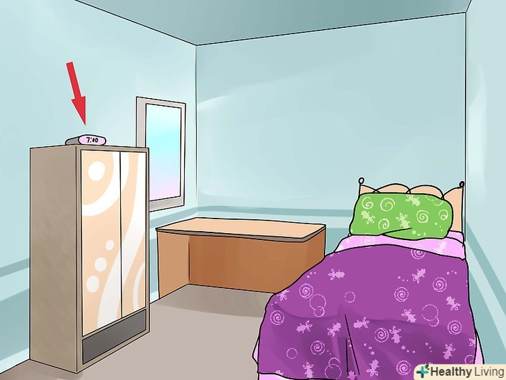 Поставте будильник подалі від ліжка.для тих, хто міцно спить, цілком нормально вимикати будильник уві сні. Якщо вам треба встати з ліжка і вимкнути його, ви збільшите свої шанси знову не заснути.- Ви також можете встановити кілька будильників у вашій кімнаті. Поставте їх з перервами в 5-10 хвилин, щоб неможливо було вимкнути все відразу.