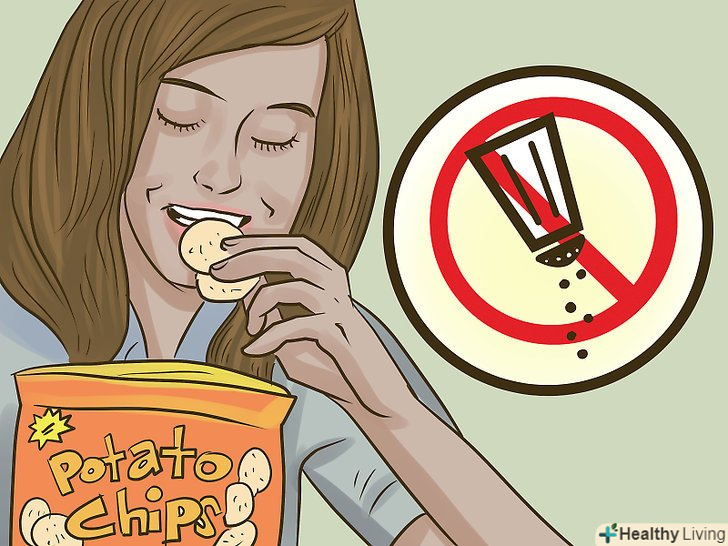Їжте менше солі.якщо в організм надходить багато солі, організм виділяє більше поту, щоб позбутися від надлишків натрію. Щоб менше потіти, слід їсти менше солі.[26]- Намагайтеся їсти менше картопляних чіпсів-в них багато солі.