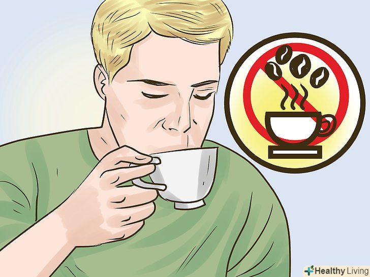 Обмежте вживання кофеїну.якщо ви п'єте багато чаю або кави, постарайтеся змінити свої звички. До складу кави і чаю входить кофеїн. Кофеїн стимулює нервову систему, через що потові залози починають працювати активніше. Якщо ви любите після обіду випити чаю або кави з шоколадом, Перегляньте свої звички.[27]- Пийте менше кофеїновмісних безалкогольних напоїв.