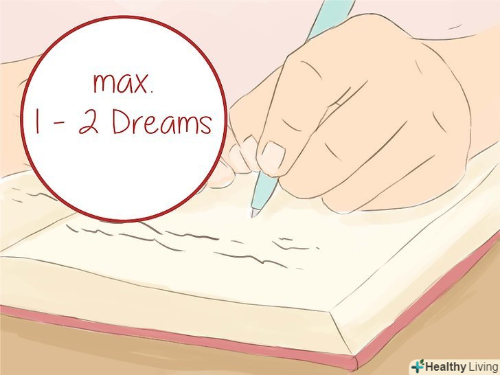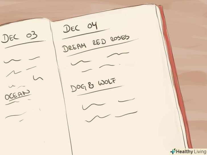 Запишіть сни.як тільки прокинетеся, почніть записувати свої сни. По можливості не ходіть в туалет, поки не зафіксуєте найголовніші моменти зі снів. Якщо між моментом пробудження і записом сну займатися чимось ще, можна забути сон. Коли ви навчитеся краще запам'ятовувати свої сни, це вже не буде проблемою, але на самому початку чим менше відволікаючих чинників у вас буде, тим краще.[6]- Запишіть все, що Ви зможете згадати. Спочатку вам буде складно відокремлювати думки він сновидінь, але поступово ви зможете чіткіше відтворювати події, що відбулися уві сні. Запишіть все, що ви пам'ятаєте про дійових осіб, символах, кольорах, фактурах, відчуттях, діях (наприклад,політ або плавання), про взаємодії з іншими істотами, про форми і все інше, що ви бачили.[7]