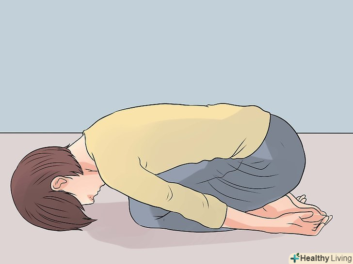 - Поза дитини. Сядьте на п'яти і покладіть руки з боків. Опустіться на коліна і акуратно опустіть лоб до підлоги.[12]