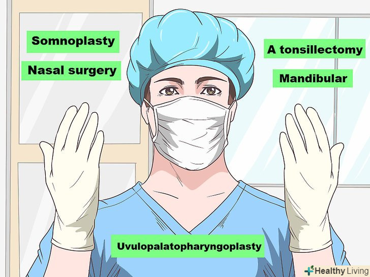 Зверніться до хірурга.люди, у яких викривлена носова перегородка, збільшені мигдалини або збільшений язик можуть бути хорошими кандидатами для різних хірургічних процедур.- Сомнопластика. Під час цієї процедури використовуються радіочастоти, які зменшують м'яке піднебіння в задній частині горла і тим самим розширюють дихальні шляхи.