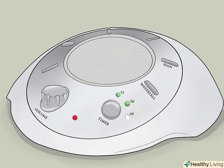 Ізолюйте вашу кімнату від сторонніх звуків.відволікаючі або докучливі звуки можуть перешкоджати вашому сну. Робіть все можливе, щоб у вашій спальні було тихо і спокійно, закривайте двері і вікна, попросіть ваших рідних вимкнути телевізор. Якщо ви ніяк не можете уникнути стороннього звуку, наприклад хропіння вашого чоловіка або шум від вечірки у сусідів зверху - використовуйте беруші. Спочатку ви можете відчувати себе дивно і вони будуть Вам заважати, але як тільки ви звикнете, то зрозумієте, що ніякої зовнішній шум вам не страшний.[3]- Інша інвестиція-це прилад, який створює білий шум або пристосування, яке створює випадкові звуки на різних частотах, які маскують зовнішні сторонні звуки. Правда звучання білого шуму може бути дещо різким , тому багато хто з цих машин виробляють так звані "кольорові" шуми, які є більш м'якими і можуть звучати як шум водоспаду або тихий гул.