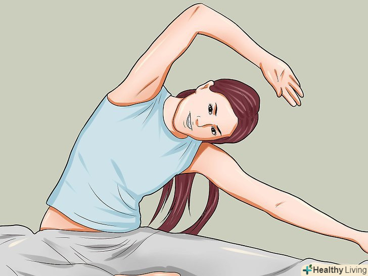 - Сядьте, схрестивши ноги, покладіть праву руку на підлогу поруч з собою, і підніміть ліву руку над вухом. Нахиліться вправо, намагаючись дістати плечима до підлоги. Затримайтеся в такому положенні протягом 10-15 секунд, потім повторіть в іншу сторону. Таким чином, розтягуються м'язи на шиї, спині, плечах і косі м'язи живота.