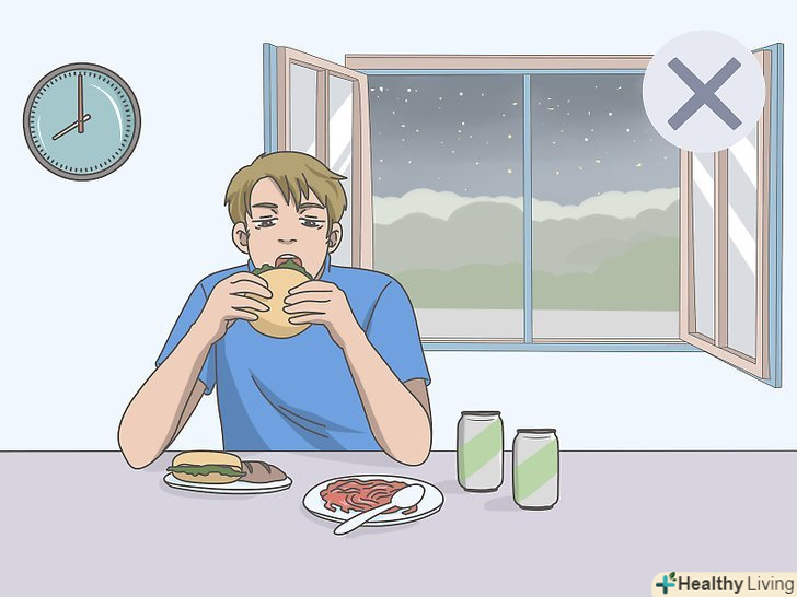 Перестаньте їсти перед сном.якщо ви звикли їсти перед сном, то намагайтеся їсти поменше або змініть час вечері. Постарайтеся не їсти за чотири години до сну.[2]- Якщо ви не можете повністю відмовитися від їжі перед сном, то хоча б скоротіть порцію. Так, важкі страви частіше викликають проблеми, ніж легкі закуски. Змініть графік харчування, щоб звикнути до зміни, а потім визначте, наскільки це допомогло вирішити проблему.