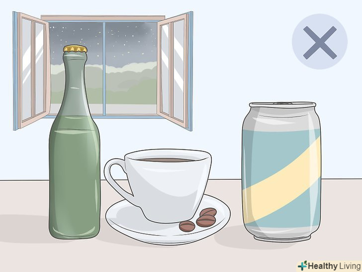 Не пийте алкоголь і кофеїнові напої пізно ввечері. Алкоголь і кофеїн можуть перешкодити нормальному, здоровому сну, тому намагайтеся не пити такі напої протягом вечора. Говорячи точніше, кофеїнові напої краще не пити після пізнього обіду, а алкоголь – після вечері.- Також скоротіть кількість інших потенційних стимуляторів-їжі та напоїв з високим вмістом цукру. Всі речовини, які заважають організму регулювати процес сну, можуть погіршити ситуацію, навіть якщо не є прямою причиною. Подібні інгредієнти стають причиною неспання (кофеїн і цукор), або несвоєчасної сонливості (алкоголь).