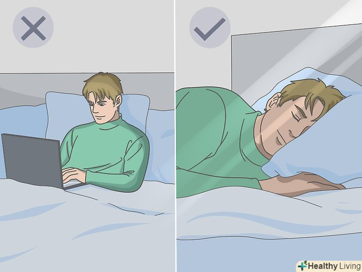Використовуйте ліжко тільки для сну. В ліжку потрібно тільки спати. Інакше кажучи, намагайтеся не читати, не дивитися телевізор, не сидіти в Інтернеті і не слухати музику лежачи в ліжку.[3]- Якщо використовувати ліжко тільки для сну, то для мозку і тіла вона буде асоціюватися зі сном. Вам буде простіше відразу заснути і забезпечити собі більш глибокий і спокійний сон.