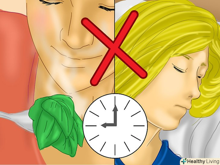 Не їжте і не споживайте алкоголь за кілька годин до сну.відомо, що алкоголь призводить до неспокійного і поганого сну. Важка їжа перед сном також може привести до неспокійного сну, викликати хропіння і постійний рух в ліжку.[5]- Намагайтеся пити одну лише воду і вечеряти за кілька годин до сну. Це дасть вашому організму достатньо часу, щоб переварити їжу і підготуватися до сну.