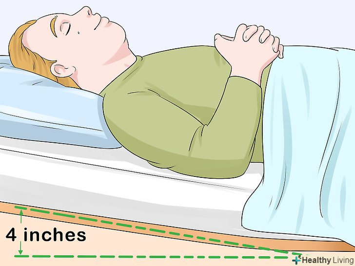 Якщо ви все ж спите на спині, підкладайте що-небудь так, щоб верхня половина тіла була піднята хоча б на 10 сантиметрів.для цього можна використовувати похилу подушку або підняти узголів'я ліжка. Таким чином ви зменшите провисання задньої стінки горла і уникнете звуження дихальних шляхів, що знизить ризик хропіння.[3]