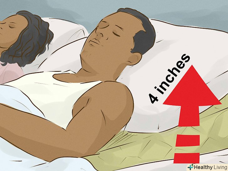 Підніміть головну частину ліжка.піднявши головну частину ліжка приблизно на 10 сантиметрів, Ви зможете послабити хропіння. Якщо у вас немає ліжка з регульованою головною частиною, можна просто підперти голову декількома подушками.[11]