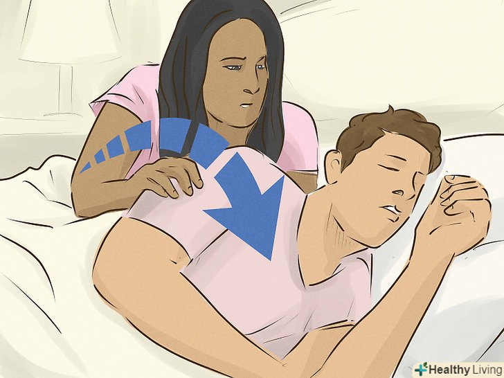 Переверніть хропіння на бік або на живіт. Іноді зміна положення допомагає зменшити хропіння. Якщо людина спить на спині, хропіння може посилитися. Попросіть людину спати на боці або на животі і поспостерігайте за тим, чи є різниця в звуці хропіння.[8]