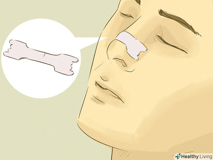 Використовуйте носові смужки.носові смужки-це смужки паперу, які потрібно поміщати на ніс перед сном. Деяким людям вони допомагають, сприяючи ослабленню хропіння. Якщо хропіння став для вас справжньою проблемою, спробуйте купити кілька носових смужок в аптеці і попросіть людину користуватися ними перед сном.[10]- Якщо хропіння викликане апное (тобто нездатністю дихати), носові смужки не допоможуть.
