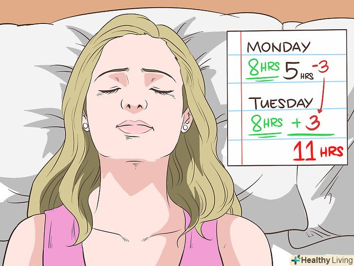 Якщо вам не вдалося виспатися, намагайтеся поспати побільше на наступний день.після одного або декількох днів недосипу люди потребують більш тривалому сні на наступний день.[15] Так що, якщо ви спали всього 5 або 6 годин в понеділок (чого зазвичай не слід допускати), постарайтеся поспати 10 або 11 годин у вівторок, щоб компенсувати недолік сну. В іншому випадку ви можете потрапити в порочне коло і відчувати себе сонним щоранку.- Однак не варто довго спати вдень, щоб компенсувати Нічний недосип. Чим ближче час нормального відходу до сну, тим шкідливіше лягати подрімати. Якщо вам дійсно потрібно поспати вдень, намагайтеся зробити це до 15:00 і не більше 45 хвилин.[4] Так ви відпочинете, на як і раніше зможете швидко заснути вночі.