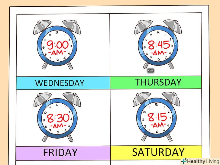 Визначте час, в який ви хочете прокидатися.якщо ви хочете бути в тонусі і готовим почати день 6 ранку, чудово! Це і буде вашою метою. Над досягненням цієї мети ви будете працювати кожен день тижня. Однак рухатися до неї ви будете поступово, щоб не викликати "системного збою" в організмі.- Так, ви зрозуміли правильно,кожен день тижня, включаючи вихідні. До тих пір поки ви не" перепрограмуєте " себе, у вас не буде ніякої можливості поспати довше. Але коли ви досягнете результату, то вже не будете мати потребу в цьому!
