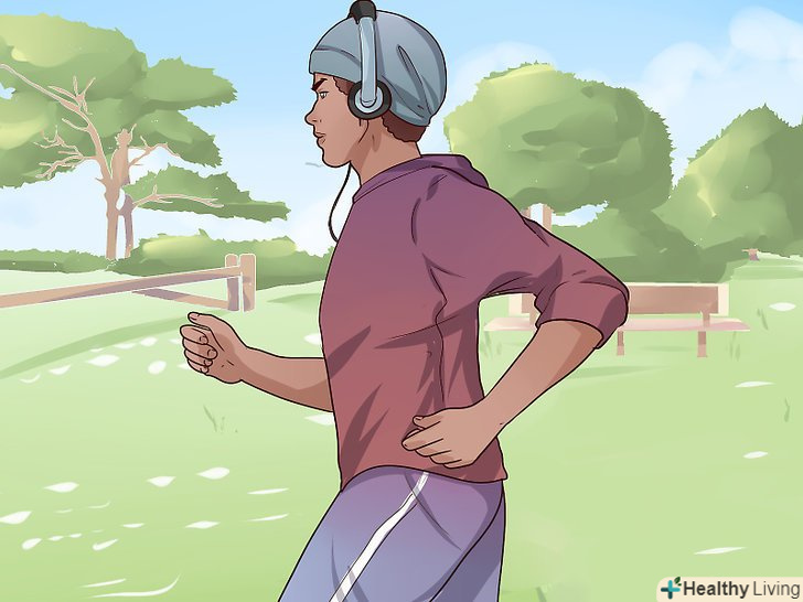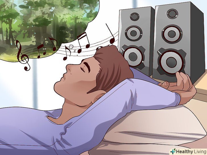 Послухайте шум навколишнього середовища. цей шум, званий також білим, являє собою набір постійних тихих звуків, які створюють фон і пригнічують інші шуми. Можна включити легку музику, звуки тропічного лісу і навіть шум обертового вентилятора. Головне, щоб звук був досить тихим.[8]- Існують генератори білого шуму, які можна замовити через Інтернет. Якщо ви віддаєте перевагу користуватися своїм телефоном, можна встановити на нього відповідний додаток, щоб він видавав білий шум. Такий генератор заглушить зовнішній шум і допоможе вам заснути.