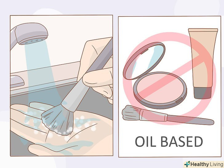 - Не використовуйте косметику на основі масла. У багатьох людей на обличчі є жирні ділянки шкіри, і косметика на масляній основі може викликати проблеми зі шкірою. Щоб пори не забивалися, шкіра не червоніла, а вугрі залишилася в минулому, не купуйте таку косметику.[22]