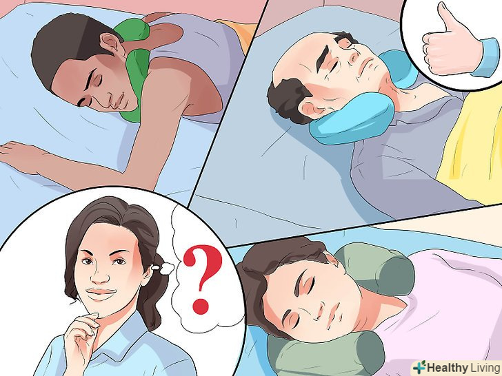 Випробуйте різні подушки.у кожної людини свої особливості будови тіла. Підбір правильної подушки має на увазі пошук такого виробу, яке найкращим чином підходить вам і Вашому тілу. Випробування різних варіантів дозволить вам вибрати ту шийну подушку, яка забезпечить найякісніший нічний сон.[30]- Пам'ятайте про те, що у вас піде близько 15 хвилин, щоб остаточно влаштуватися на подушці для сну. Крім того, буде потрібно приблизно тиждень, щоб зробити висновок про зручність конкретної шийної подушки.[31] у магазині іноді буває важко визначитися з тим, яка ж подушка найкраще Вам підходить. Тому розпитайте продавців магазину щодо умов повернення та обміну подушки, якщо вона вам не підійде.