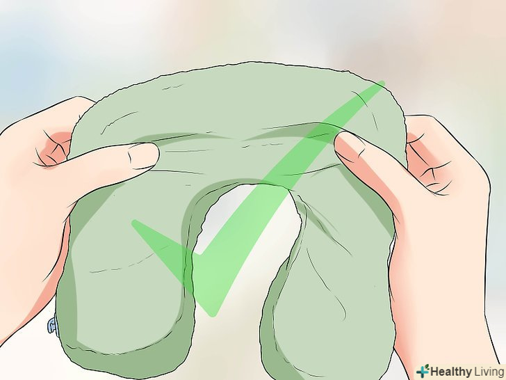 Поправте набивання подушки для додаткового комфорту.багато сучасних шийні подушки набиті кульками або гелем. Поправте набивання в зручну для вас сторону, щоб забезпечити собі додатковий комфорт. Перетягніть подушку гумкою для волосся або іншим предметом, щоб набивка не зміщувалася.[8]