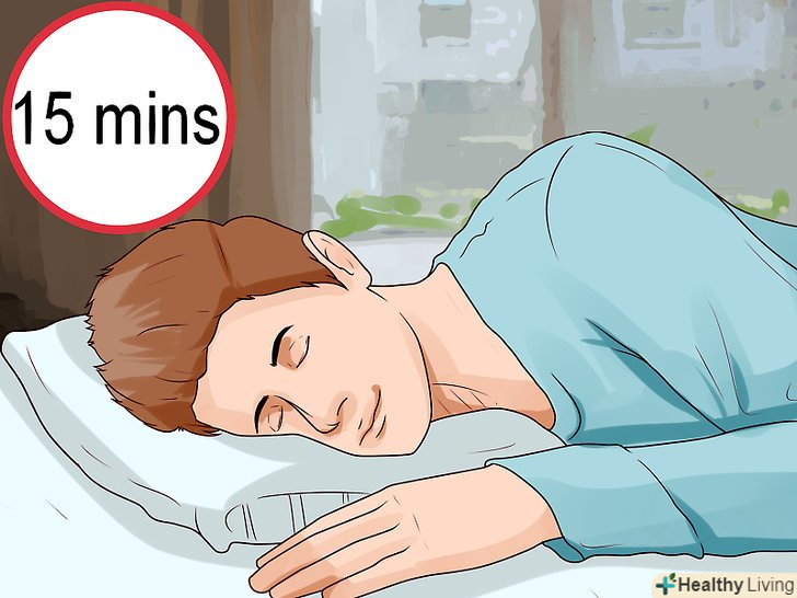 Вирішіть, як довго ви збираєтеся спати.іноді достатньо подрімати 15 хвилин, в інших випадках може знадобитися кілька годин сну. Вирішіть, як довго ви плануєте спати, і обмежте себе відведеним часом. Якщо у вас є обмежений час для сну, подбайте про те, щоб Ви встигли повністю прокинутися і підготуватися до майбутніх справ.- Можливо, ви захочете змінювати тривалість денного сну в залежності від режиму. Тривалість сну може залежати також від того, яких результатів ви хочете досягти. Наприклад, досить подрімати 20 хвилин, щоб відпочити під час автомобільної поїздки, а якщо ви хочете поліпшити здатність приймати рішення, краще поспати 60-90 хвилин.[7]