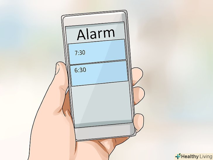 Заздалегідь виставляйте будильник.якщо ви дотримуєтеся звичайного режиму сну, вам потрібно привчити себе щодня прокидатися в один і той же час. Можна кожен день виставляти будильник на один і той же час. Поступово ваш організм звикне пробуджуватися в цей час. Зрештою, ви, можливо, почнете прокидатися на кілька хвилин раніше в очікуванні сигналу будильника.[4]- Якщо ви знаєте, що для того, щоб будильник розбудив вас, потрібен деякий час, встановлюйте його за п'ятнадцять хвилин до того, як вам потрібно буде встати.