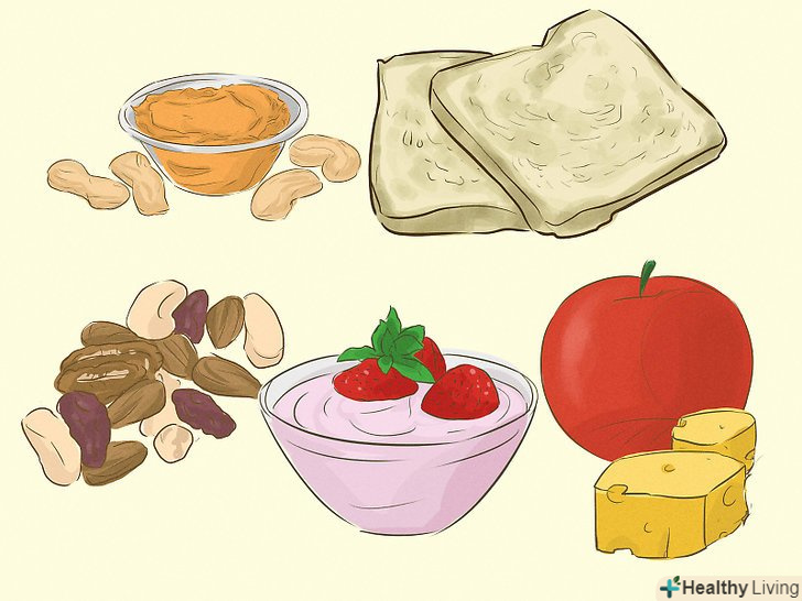 Виключіть цукор зі свого раціону.якщо ви відчуваєте втому, швидше за все, вам хочеться з'їсти щось солодке, і бажано у великій кількості. Спробуйте замість цього перейти на складні вуглеводи та білки. Цукор дасть вам швидкий сплеск енергії, але так само швидко ця енергія піде на спад. З іншого боку, складні вуглеводи вважаються найкращим джерелом енергії, особливо в поєднанні з білком.[8]- Наприклад, з'їжте цільнозерновий скибочку хліба з арахісовим маслом або шматочок фрукта з сиром.