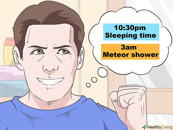 Плануйте свій нічний режим.всі ми володіє різним запасом сил, який залишається в разі недосипу або відсутності сну. Деяким абсолютно достатньо 4 годин сну, тоді як іншим потрібно більше 8 годин.[6] розрахуйте час оптимального сну для виконання поставленого завдання, а потім сплануйте свій нічний режим. Наприклад, якщо ви хочете прокинутися о третій годині ранку і побачити метеоритний дощ, при цьому ви знаєте, що чотирьох годин сну вам цілком достатньо для нормального самопочуття, то лягайте спати приблизно о 22:30.- Якщо ви хочете прокинутися посеред ночі заради особливого одноразового події, то рекомендується спланувати точний час відходу до сну. Якщо ж ви намагаєтеся змінити режим сну на більш тривалий час, то відрегулюйте новий цикл природним чином, без вимушених зусиль.[7]