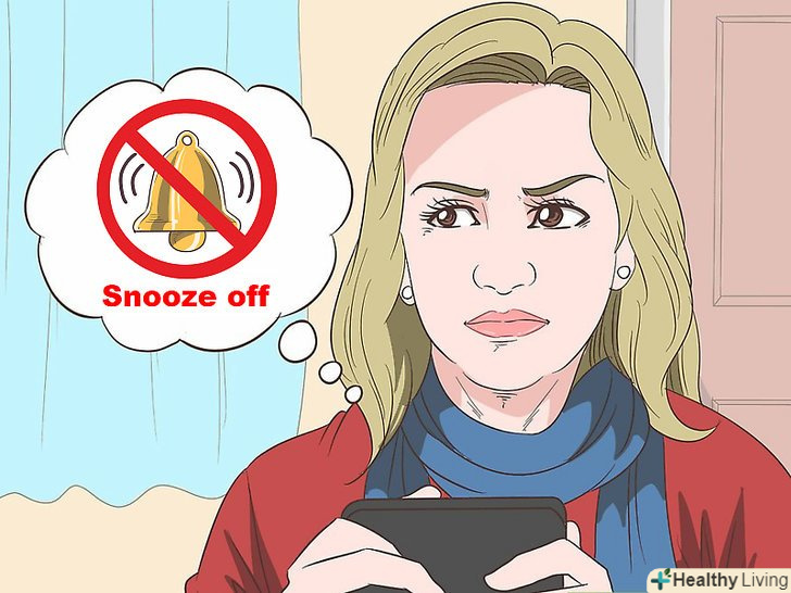 Не використовуйте такі функції, як кілька будильників або повторення сигналу.небезпека таїться в наступному: при спрацьовуванні цієї функція людина знаходиться в напівсвідомому стані і зазвичай інстинктивно відключає будильник. Якщо натиснути кнопку повторення сигналу багато разів, то згодом ви запізнитеся або встанете з ліжка стомленим. Під час першого сигналу будильника адреналін і кортизон викликають стресову реакцію негайного пробудження, тому натискання кнопки повторення сигналу пригнічує природні функції організму, дезорієнтує і створює відчуття слабкості.[8]