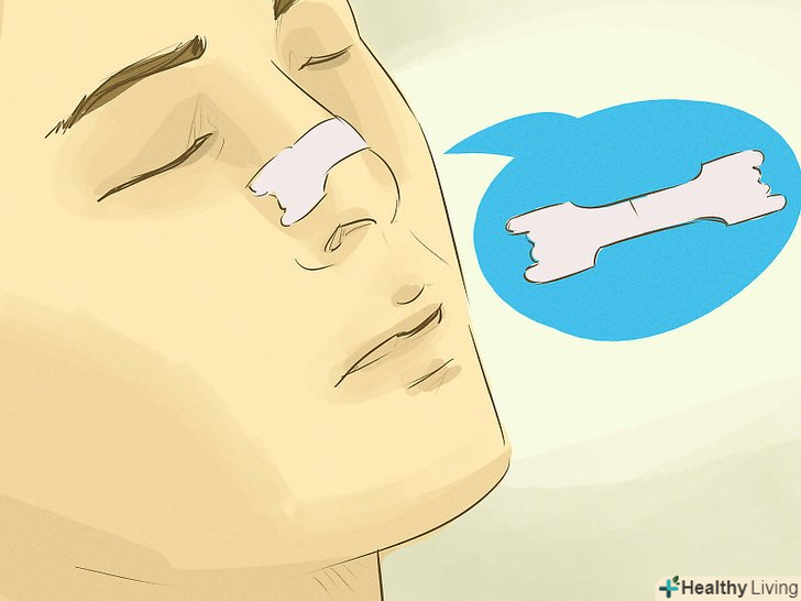 Спробуйте пластир для носа. пластир для носа - це безрецептурний спосіб поліпшити рух повітря в порожнині носа. Пластир для носа злегка відтягує ніздрі, відкриваючи і утримуючи їх в такому положенні. Поліпшивши рух повітря в порожнині носа, можна зменшити хропіння. [13]- Засипати з пластиром на носі спочатку може бути незвично. Однак, якщо ваш партнер продовжить користуватися пластиром, він скоро до нього звикне.