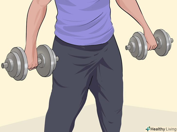 Регулярно тренуйте витривалість. Саркопенією називають стан, при якому чоловікам складніше набрати і підтримувати м'язову масу. Зазвичай у чоловіків цей стан розвивається після 30 років. Однак, втрату м'язової маси можна уповільнити або зупинити, якщо регулярно тренувати витривалість.- Використовуйте гантелі або виконуйте різні силові вправи (наприклад, віджимання), щоб напружувати м'язи по максимуму. Постарайтеся поступово збільшувати вагу і навантаження. [23]
