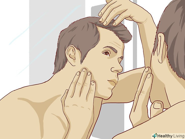 Слідкуйте за станом лінії росту волосся на лобі.чоловіче облисіння зазвичай починається спереду прямо біля лінії росту волосся. У більшості випадків облисіння за чоловічим типом лінія росту волосся поступово відступає і починає набувати обриси літери "M", при цьому віскі рідшають швидше, ніж центральна секція волосся.[12] поступово волосся стає тонше і коротше, а з боків голови проявляються підковоподібні залисини. Їх поява є ознакою просунутої стадії облисіння, а у деяких чоловіків ця стадія може закінчуватися навіть повним облисінням.- Стежити за лінією росту волосся можна, порівнюючи власне відображення в дзеркалі і свою фотографію в більш молодому віці.