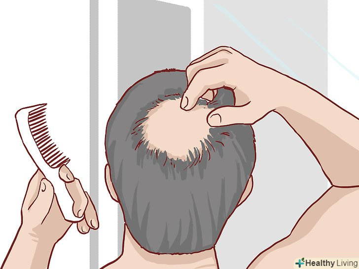 Перевіряйте стан верхівки.на додаток до витончення і порідіння волосся у передній лінії їх зростання, той же самий процес може спостерігатися і на маківці.[13] іноді порідіння верхівки передує відступання передньої лінії росту волосся, іноді воно настає пізніше, а часом відбувається одночасно. Як вже говорилося, волосяні фолікули верхівки чутливі до рівня ДГТ, причому помітно сильніше, ніж ділянки волосся над вухами і на потилиці.- Щоб перевірити стан волосся на маківці, вам буде потрібно піднести ручне дзеркальце до верхівки і поглянути в нього через стаціонарне дзеркало. В якості альтернативи, можна попросити кого-небудь сфотографувати вашу верхівку. Щоб оцінити ступінь випадіння волосся, порівнюйте фотографії верхівки різної давності.