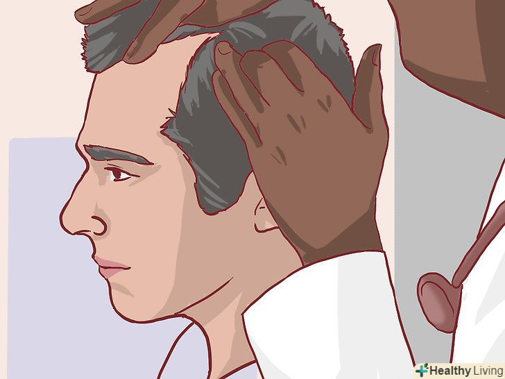 Проконсультуйтеся у трихолога.щоб точно упевнитися в тому, що у вас спостерігається облисіння за чоловічим типом, призначте візит до трихолога (дерматолога, що спеціалізується на лікуванні волосистої частини шкіри голови). Типове чоловіче облисіння зазвичай може бути діагностовано простим візуальним оглядом і аналізом картини випадіння волосся.[17] проте, лікар також розпитає вас про ваших родичів і їх схильності до облисіння (зокрема, по материнській лінії) і уважно вивчить вашу шкіру за допомогою денситометра (спеціального збільшувального приладу), щоб оцінити ступінь всихання волосяних фолікулів.- Щоб діагностувати облисіння, не потрібно проводити аналіз структури волосся або робити зішкріб шкіри голови.