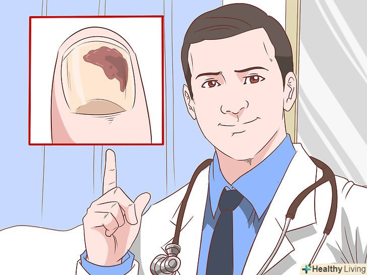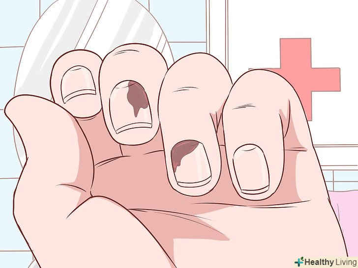 Переконайтеся в тому, що ви не пошкодили нігтьове ложе.[12] Травму нігтьового ложа визначити досить легко: в такому випадку під нігтьової пластиною ви виявите темні плями. Чорна або синє забарвлення під нігтем говорить про локальному кровотечі в цій області. В цьому випадку вам необхідно проконсультуватися з лікарем і обговорити подальший план лікування. Якщо кровотеча незначна, швидше за все, пошкодження заживе самостійно без будь-яких ускладнень. Але великі гематоми нігтьового ложа різко болючі і вимагають консультації хірурга. Лікар може сам провести процедуру, щоб зняти напругу під нігтьової пластиною, або дати вам вказівки і рекомендації з приводу того, як зробити це самостійно.- Якщо крововилив стався менше 24 годин тому, лікар повинен розкрити гематому. Після 48 годин кров згортається, і необхідності в цій маніпуляції немає. Крім того, лікар перевірить, чи не постраждали судини і нерви біля місця пошкодження, і оцінить, як функціонують всі суглоби пальців.