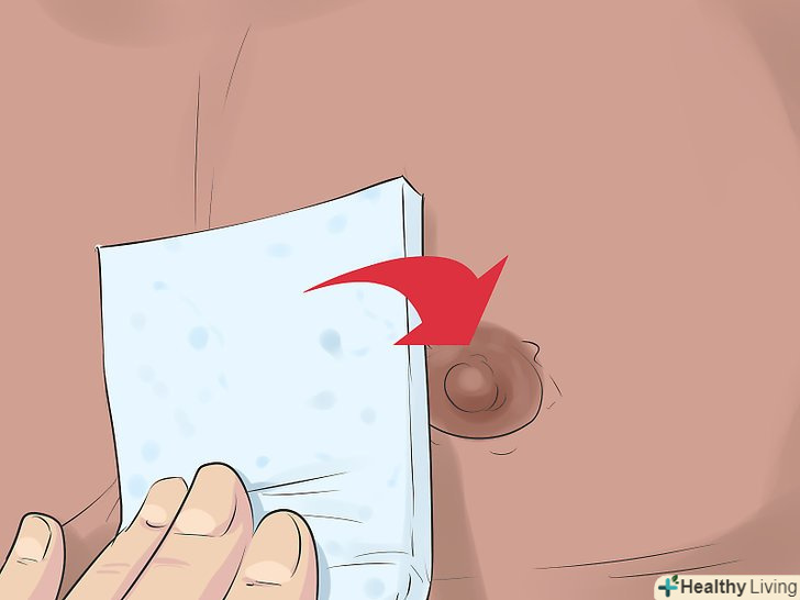 Покладіть на шкіру ортопедичну прокладку або піну.після того, як ви вимиєте, поголите плече і завдасте на нього липкий спрей, прикрийте чутливі ділянки (сосок, прищі, фурункули, не до кінця загоєні рани тощо) тонкою прокладкою або піною. Таким чином ви позбудетеся від болю і роздратування шкіри при подальшому знятті пов'язки.[6]- Щоб заощадити матеріал і час, розріжте прокладку на невеликі шматочки і прикладіть їх до соска і іншим чутливим ділянкам шкіри. Матеріал прокладки хоча б ненадовго пристане до нанесеного раніше липкого спрею.