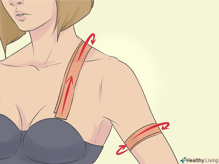 Накладіть опорні смужки.почніть перев'язку з накладання опорних лямок на м'язи плеча і біцепса, розташовані в передній частині передпліччя. Протягніть стрічку від основи соска вгору до плеча і навколо нього, приблизно до середини лопатки. Для міцності додайте поверх першої стрічки ще один-два шари. Після цього обв'яжіть середину біцепса двома або трьома смужками стрічки.[7]- Завершивши попередній крок, протягніть опорну смужку стрічки від соска до верхньої частини спини, а ще одну оберніть навколо біцепса.
