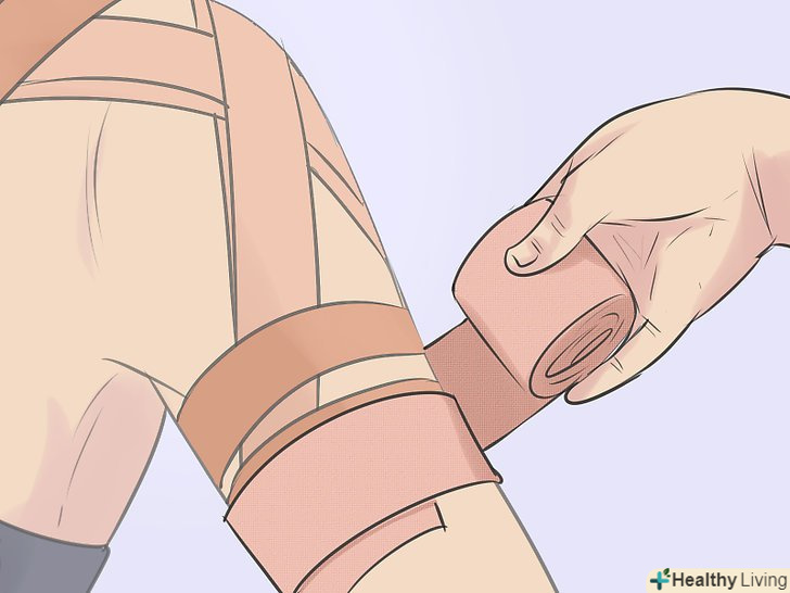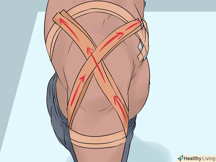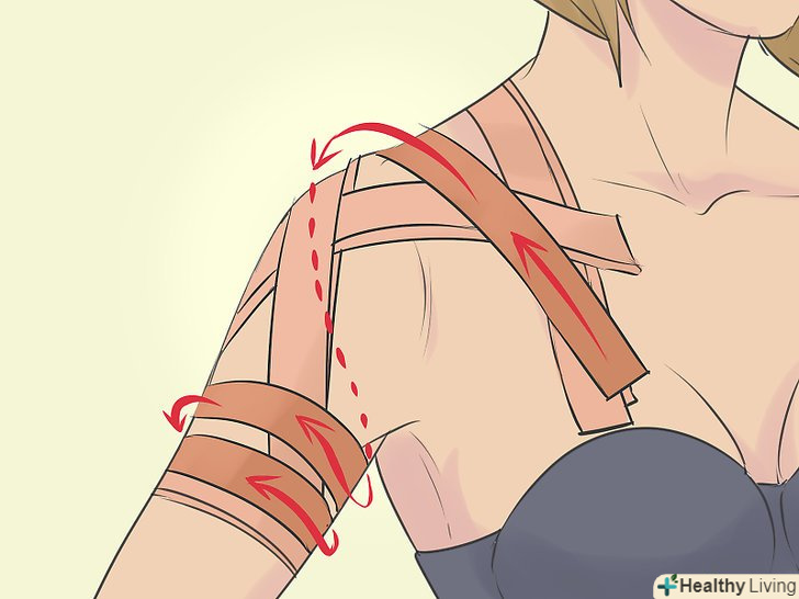 Накладіть на плече пов'язку у вигляді літери "X".зафіксуйте плече, наклавши на нього по пересічних діагоналях дві або чотири смуги, що з'єднують опорні пов'язки. В результаті у вас вийде перев'язь у формі літери "X", або хреста, центральна точка (місце перетину смуг) якого буде розташовуватися на бічних м'язах передпліччя, званих дельтоподібної м'язом.[8] необхідно накласти як мінімум дві смужки, але пов'язка буде надійніше, якщо ви зробите чотири смужки.- Перев'язуючи плече, Натягуйте стрічку, але не надто сильно, щоб пов'язка була зручною. Якщо пов'язка заподіює вам біль, зніміть її і накладіть заново.