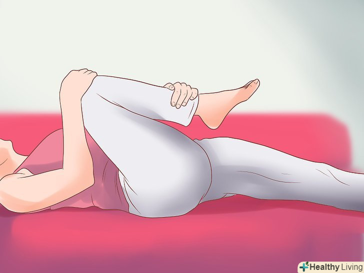 Зробіть розтяжку сідничної області.Нерухомість сідничних м'язів може чинити тиск на основні нерви, що призводить до обмеження нервів і болю в стегні. Розтяжку сідничної області можна використовувати і для зняття нервової напруги.- Ляжте на підлогу з витягнутими ногами. Зігніть коліно на стороні постраждалого стегна і підніміть його до грудей.
