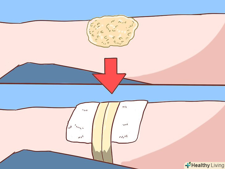 Нанесіть мазь з антибіотиком і перев'яжіть рану.використовуйте ватяну паличку, щоб нанести тонкий шар мазі з антибіотиком, потім накладіть стерильну пов'язку на рану. У разі необхідності підсушіть поверхню шкіри навколо рани, щоб пов'язка приклеїлася до здорової шкіри.[13]- Не забувайте міняти пов'язку як мінімум один раз в день, якщо ж пов'язка намокла або стала брудною, видаліть її негайно і замініть свіжою.
