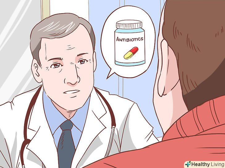 Обговоріть з лікарем, яке лікування антибіотиками (місцеве або пероральний прийом) показано у вашому випадку.після того, як лікар огляне рану, запитайте, яку антибіотикотерапію він вам призначить. У більшості випадків призначають місцеве лікування-вам потрібно буде накладати мазі з антибіотиком безпосередньо на область розвитку інфекції.[16]- Пероральні, або системні, антибіотики-це препарати, які людина приймає через рот, після чого діючі речовини всмоктуються в травному тракті і потрапляють в кров. Лікар призначає курс пероральних антибіотиків, якщо є підстави вважати, що інфекція поширюється за межі рани, а також в разі загального зниження імунітету хворого. Обов'язково повідомте лікаря про підвищену температуру і інших симптомах запального процесу. Крім того, необхідно проінформувати лікаря, якщо у вас є які-небудь хронічні захворювання або ви приймаєте медичні препарати, що впливають на імунну систему.[17]