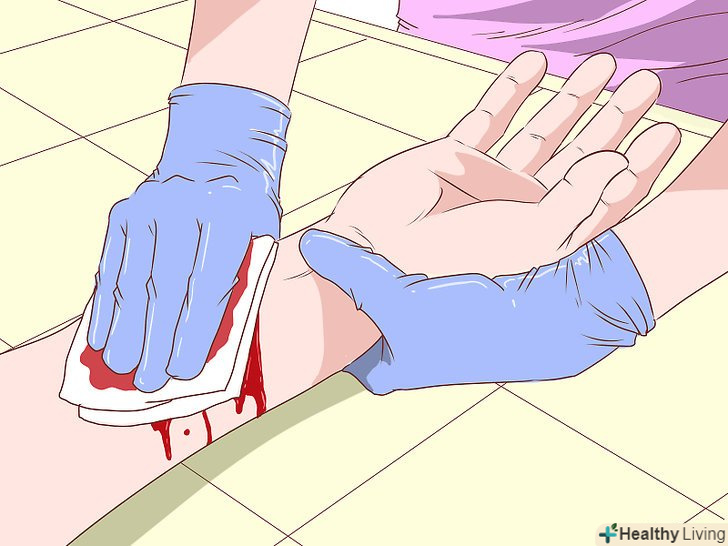Зупиніть кровотечу. невеликі рани (поверхневі садна або неглибокі порізи) мимовільно припиняють кровоточити протягом декількох хвилин. Якщо потрібно, закрийте пошкоджене місце чистою тканиною або бинтом і обережно притисніть тканину до шкіри. Якщо можливо, підніміть травмовану частину тіла, щоб рана виявилася вище положення серця.[11]- Наприклад, якщо рана розташована на руці або щиколотці, підніміть травмовану кінцівку, щоб вона виявилася вище лінії серця.