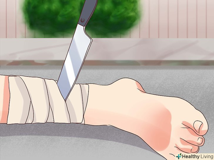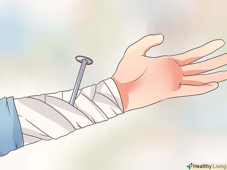 Зафіксуйте предмет в рані.якщо це великий і важкий предмет (наприклад, ніж або інший предмет, який може зміститися), його потрібно якось закріпити. Якщо предмет зміститься всередині вас, то завдасть ще більше шкоди. Предмет можна закріпити, обережно перев'язавши рану.[4]- Закріпіть предмет краще, взявши чисту марлю, звернувши її в валик і розмістивши навколо предмета. Приклейте згорнуту марлю» ізбой " (горизонтальні лінії пластиру клеяться внахлест під кутом в 90 градусів). Це дасть достатню висоту, щоб сильніше зафіксувати предмет.